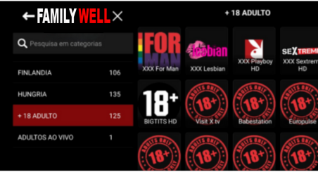 Toda a lista de canais adultos protegido com senha para bloqueio e segurança das crianças.